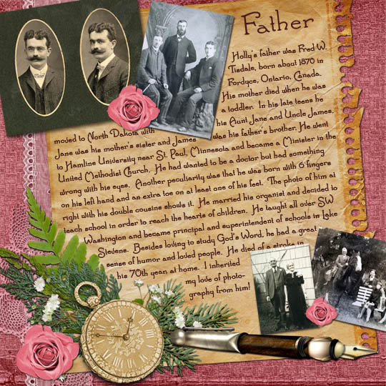 Father is one of my layouts from my Grandmother's Life Book. I briefly summarized who her father was on one side and her mother on the other. The layout is pink because it is in my Grandma's book and pink was her favorite color!